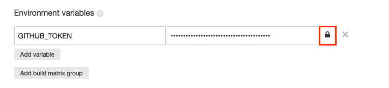 Under the heading Environment variables, add a custom environment variable named GITHUB_TOKEN, with the value set to the personal access token that was generated in the first step. Ensure that you toggle variable encryption by clicking on the padlock.