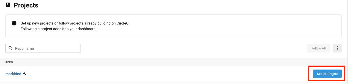 In the projects dashboard, click on the Set Up Project button beside the repo containing your MarkBind site.